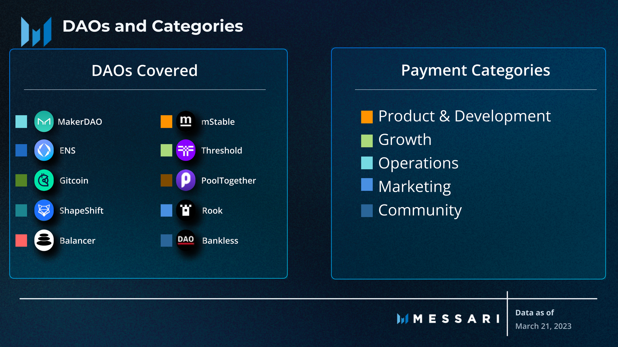 After selecting the 10 DAOs to cover, we categorized these payments into five expense categories: Product & Development, Growth, Operational, Marketing, and Community.
