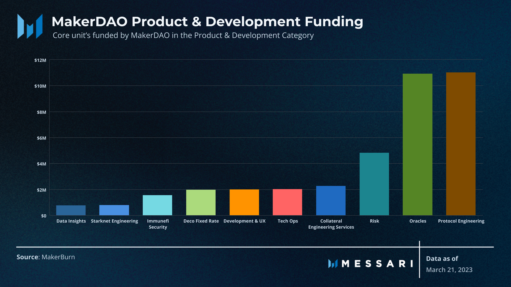 MakerDAO allocated a leading $38 million in funding to Product & Development initiatives in 2022. Product-related initiatives represent 75% of the total $51 million MakerDAO allocated to Core Units in 2022 (note: some will vest over time and is not immediately paid out). The Protocol Engineering (PE) Core Unit received the most funding within MakerDAO's Product & Development expenses, with $11 million allocated in 2022.