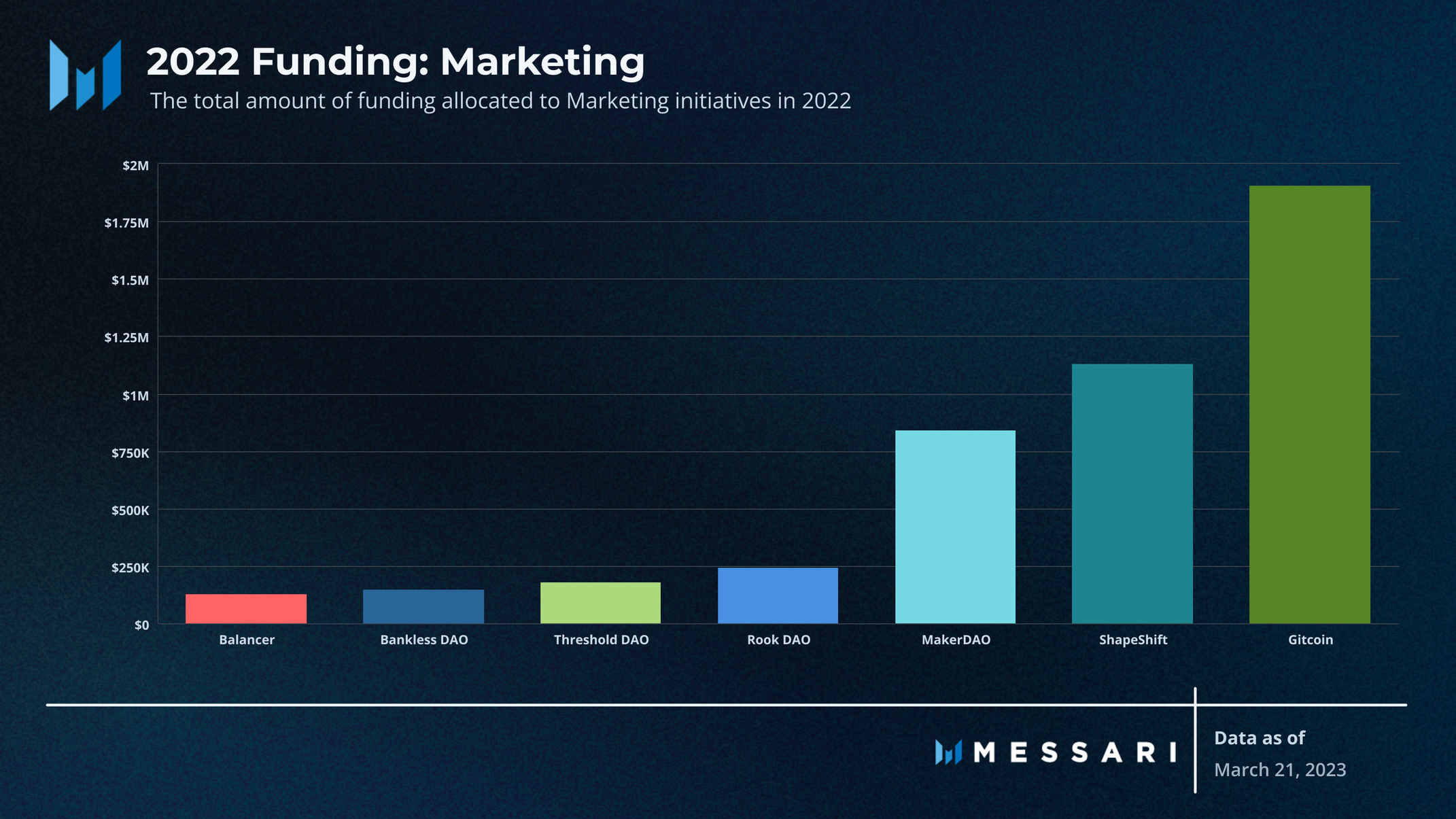 In 2022, Gitcoin's Merch, Memes, & Marketing workstream received the highest funding allocation for DAO marketing, totaling $1.9 million.