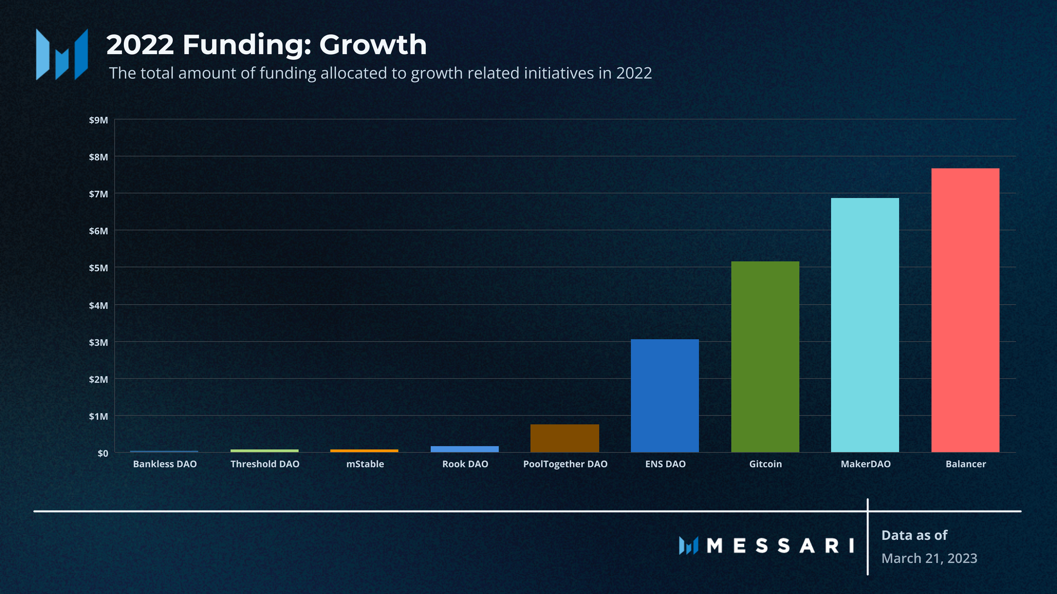 The Growth category covers a range of initiatives that aim to grow protocol usage. Some examples of these groups include Balancer's Grants program, MakerDAO's Growth Core Unit, and ENS's and Gitcoin's Public Goods initiatives.
