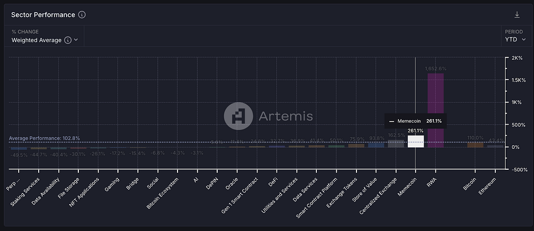 According to data from Artemis Terminal, as of November 27, meme coins have delivered stellar performance in 2024, achieving a 261% year-to-date growth, making them the second-best-performing sector in the crypto space, trailing only RWA (Real World Assets).