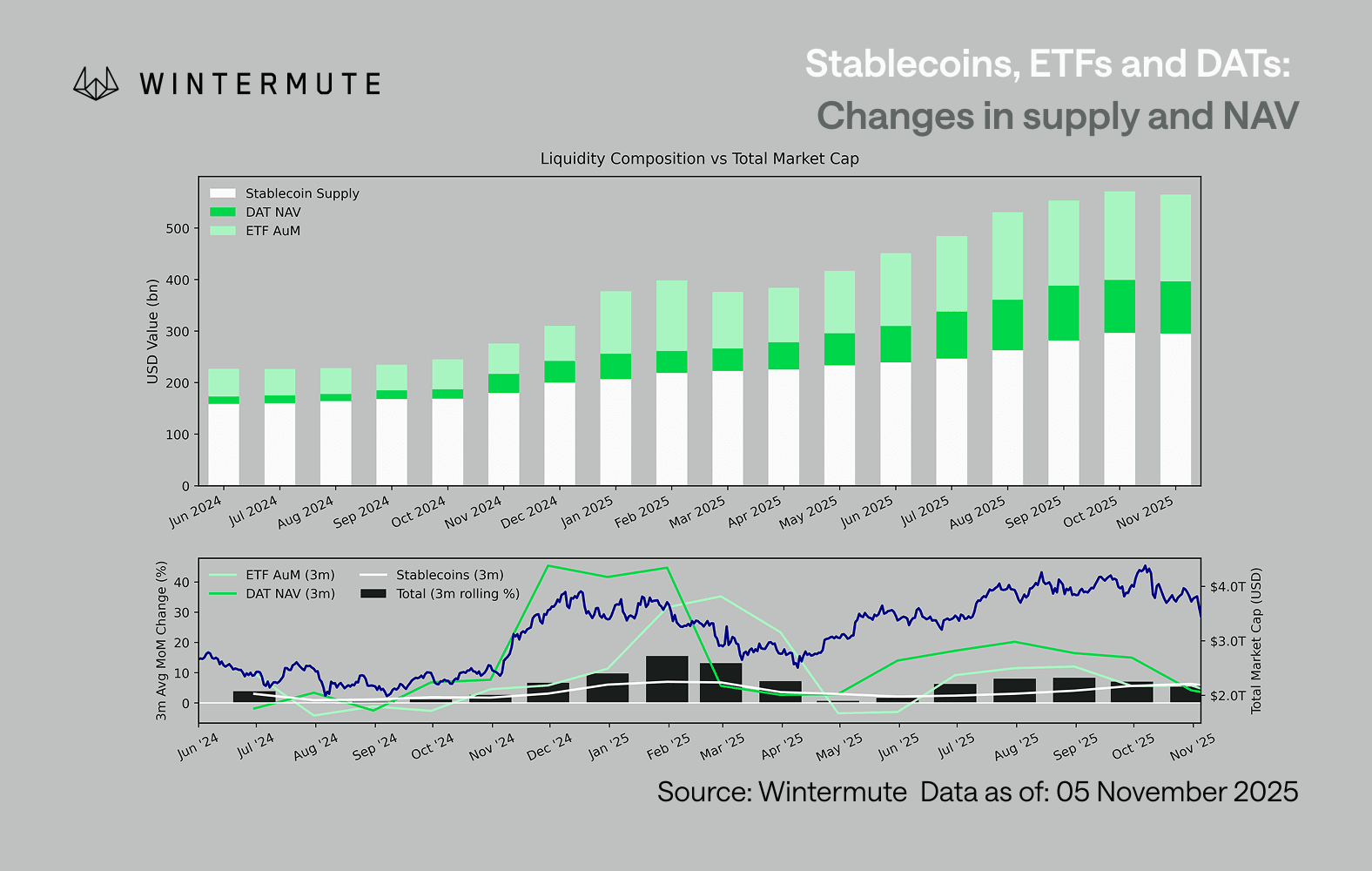 Liquidity defines every crypto cycle. Adoption might drive the long-term story, but it is the flow of money that moves prices. Over the past few months, that momentum of inflow has slowed down. Across all three channels through which capital enters the ecosystem, stablecoins, ETFs and digital asset treasuries (DATs), momentum has faded, leaving crypto in a self-funded phase rather than one of expansion.